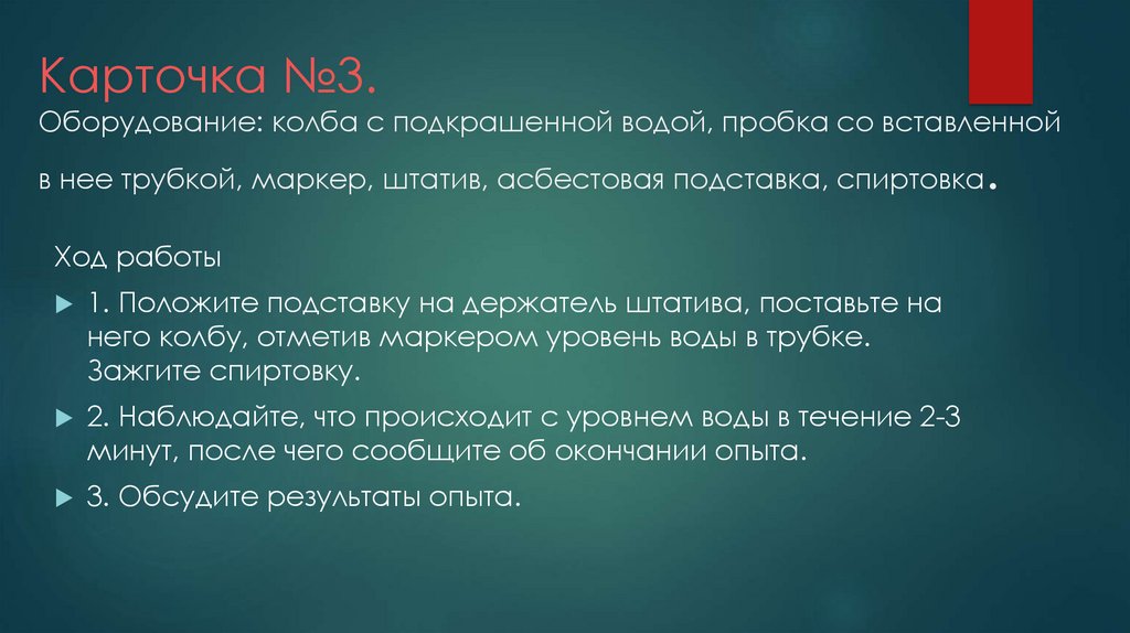 Карточка №3.Оборудование: колба с подкрашенной водой, пробка со вставленной