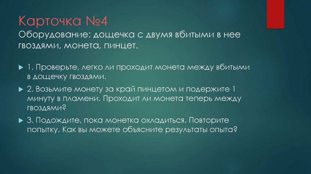 Карточка №4Оборудование: дощечка с двумя вбитыми в нее