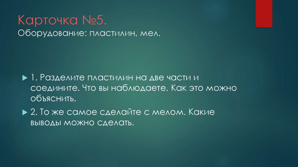 Карточка №5.Оборудование: пластилин, мел.