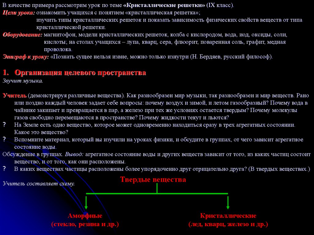В качестве примера рассмотрим урок по теме «Кристаллические решетки» (IX класс).Цели урока: ознакомить учащихся с понятием «кристаллическая решетка»;
