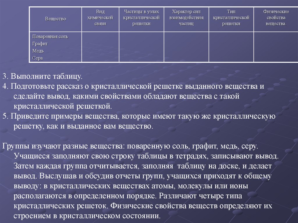 4. Подготовьте рассказ о кристаллической решетке выданного вещества и