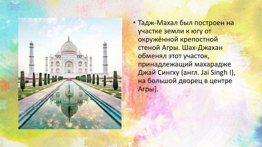 • Тадж-Махал был построен научастке земли к югу от