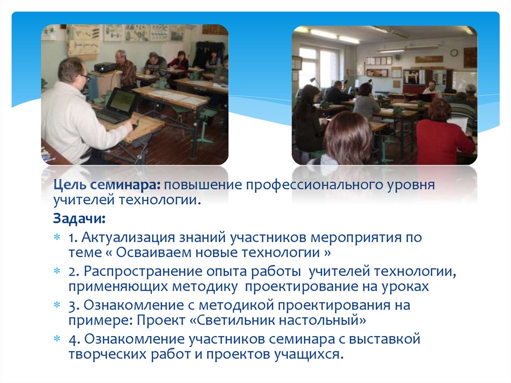 Цель семинара: повышение профессионального уровняучителей технологии.