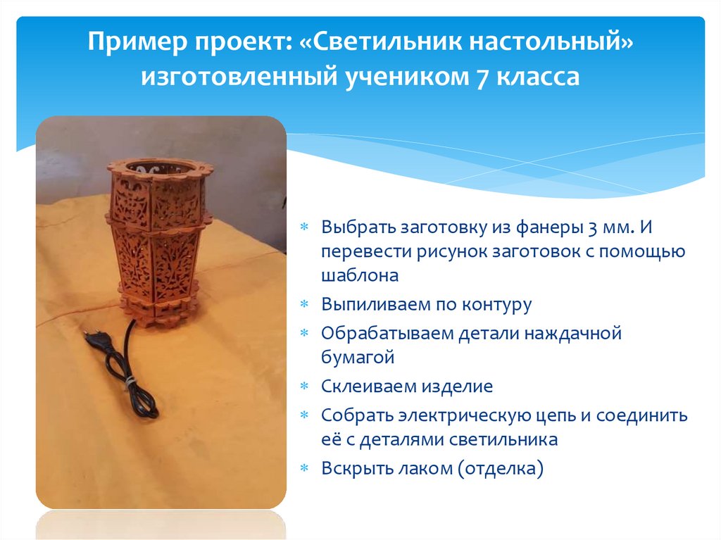 Пример проект: «Светильник настольный»изготовленный учеником 7 класса