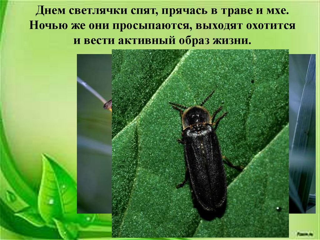 Днем светлячки спят, прячась в траве и мхе.Ночью же они просыпаются, выходят охотится