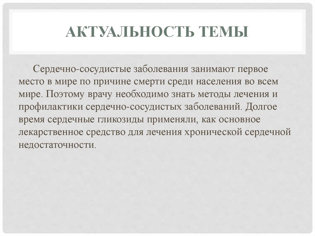 АКТУАЛЬНОСТЬ ТЕМЫСердечно-сосудистые заболевания занимают первое