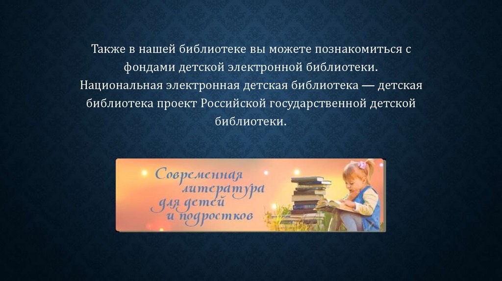 Также в нашей библиотеке вы можете познакомиться сфондами детской электронной библиотеки.
