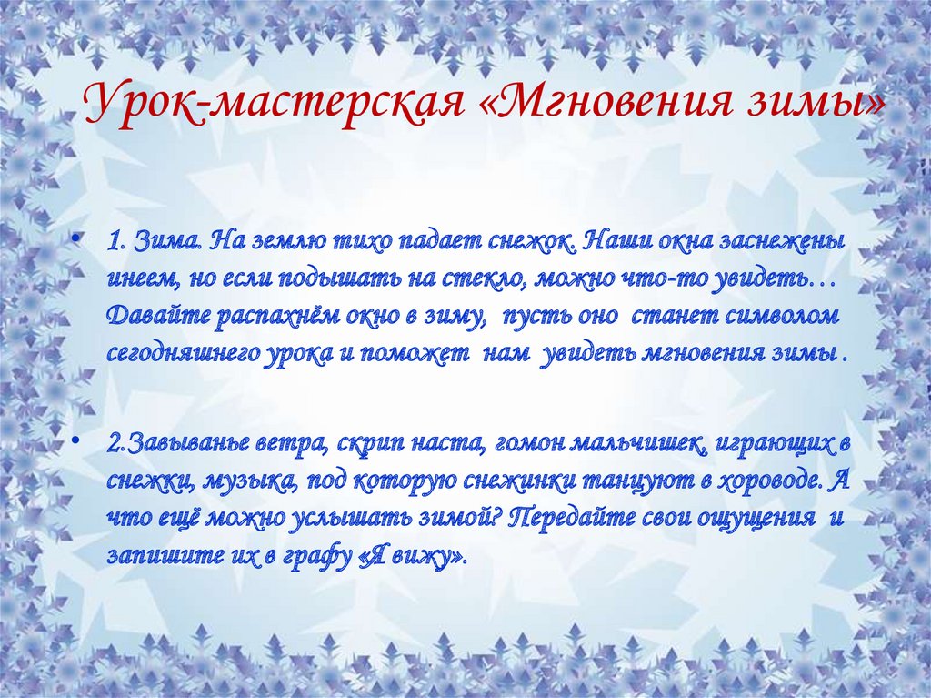 Урок-мастерская «Мгновения зимы»• 1. Зима. На землю тихо падает снежок. Наши окна заснежены