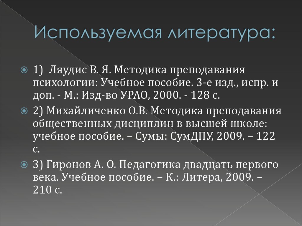 1) Ляудис В. Я. Методика преподаванияпсихологии: Учебное пособие. 3-е изд., испр. и