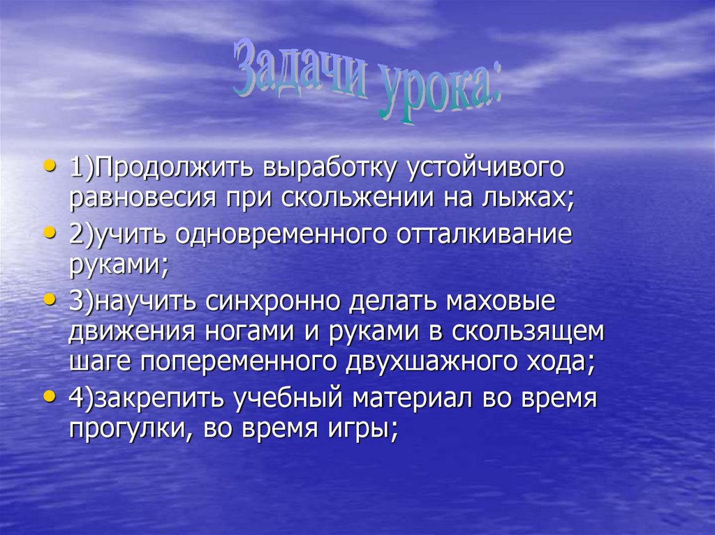 • 1)Продолжить выработку устойчивогоравновесия при скольжении на лыжах;