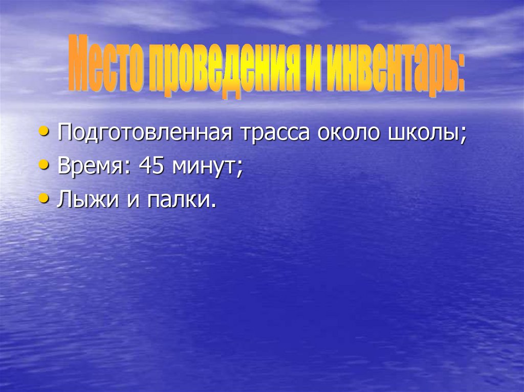 • Подготовленная трасса около школы;• Время: 45 минут;