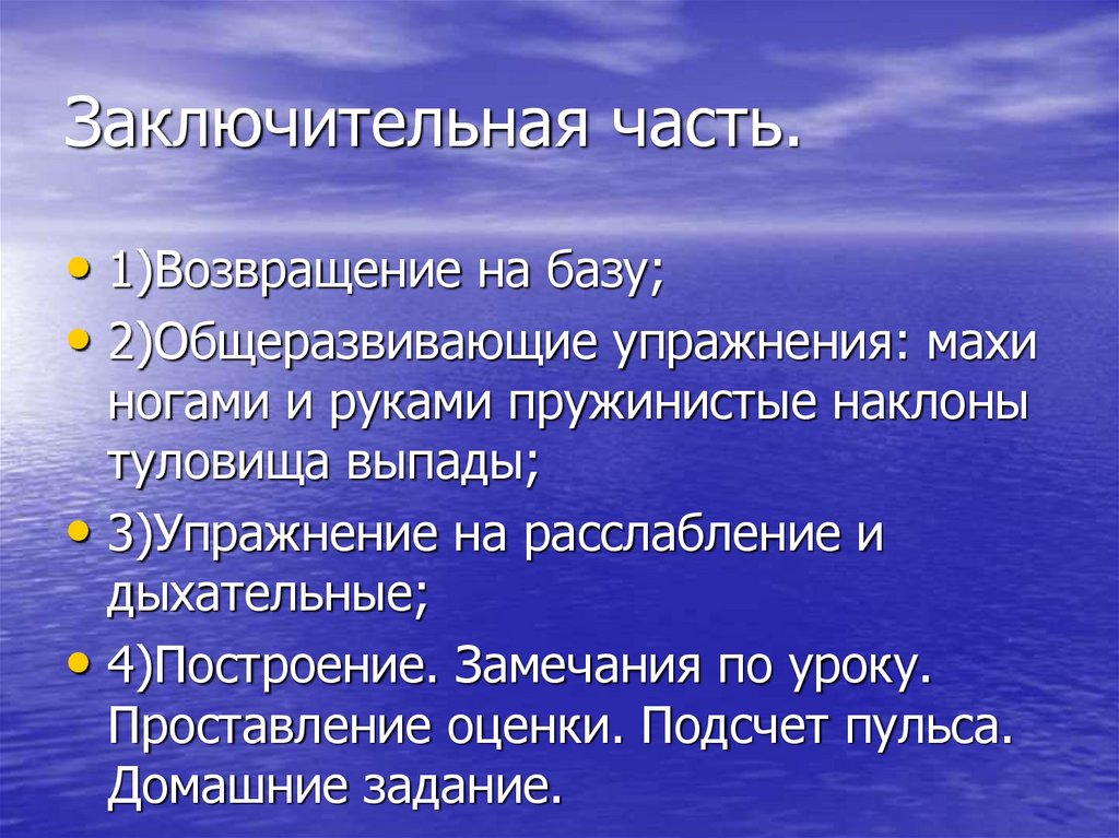 • 1)Возвращение на базу;• 2)Общеразвивающие упражнения: махи