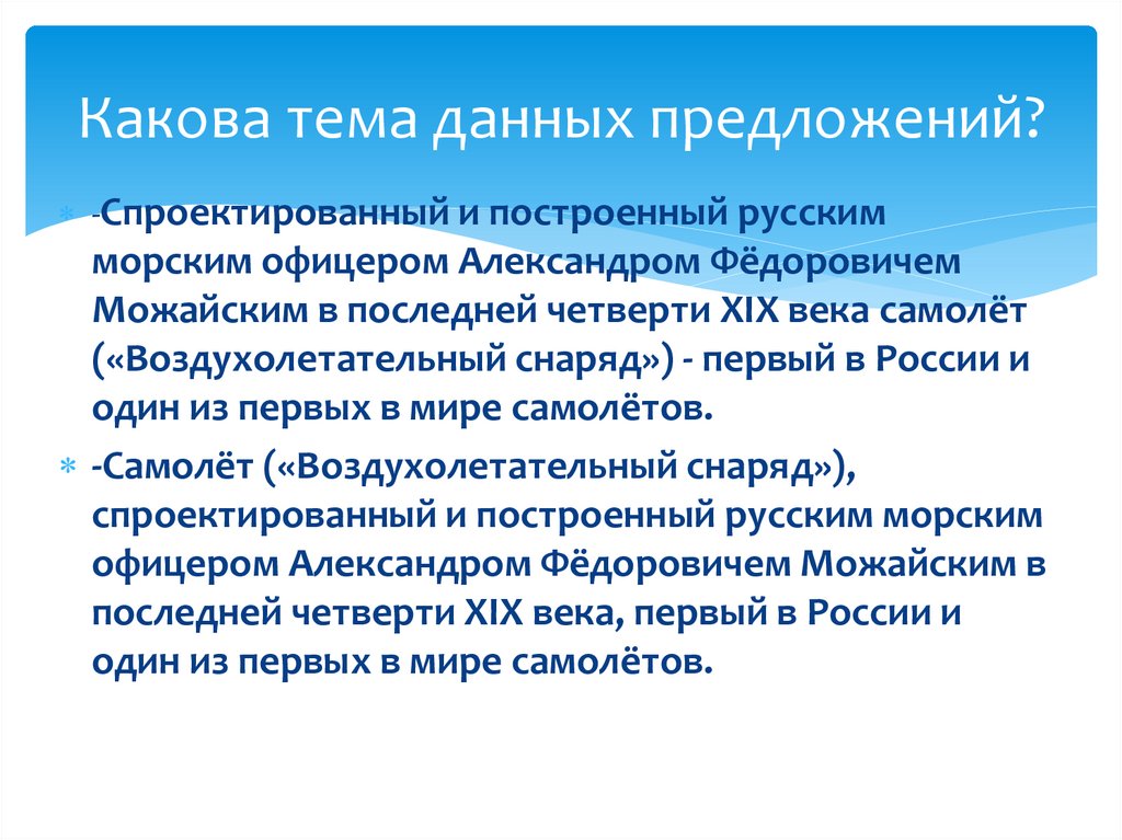 Какова тема данных предложений?-Спроектированный и построенный русским