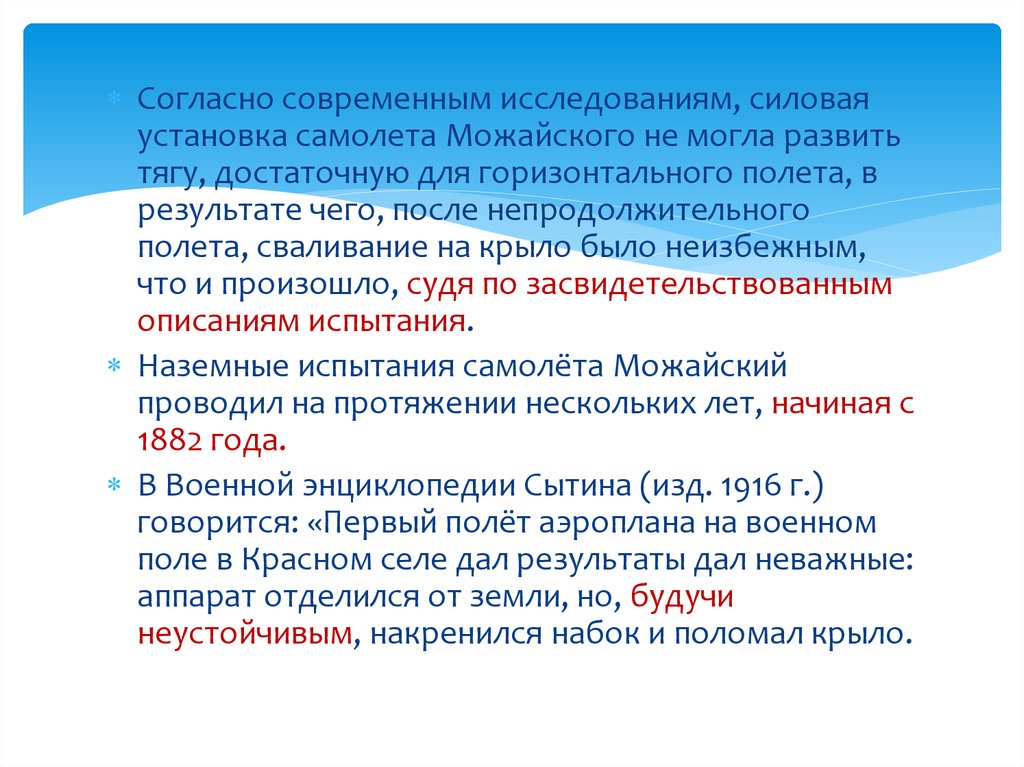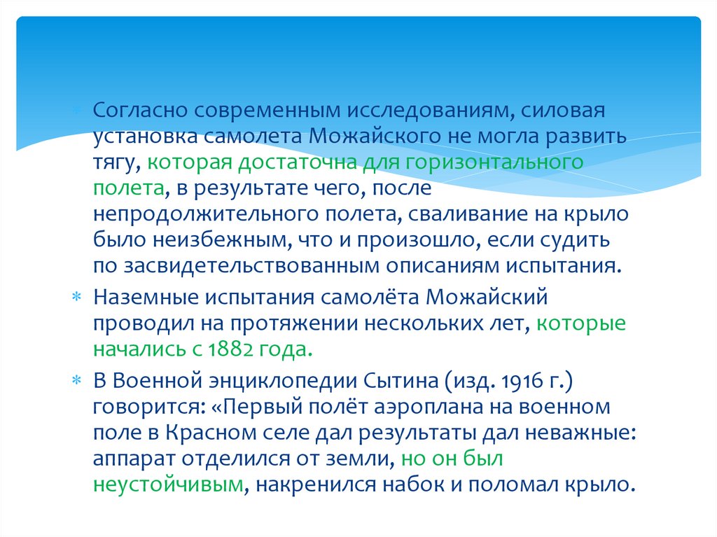 Согласно современным исследованиям, силоваяустановка самолета Можайского не могла развить