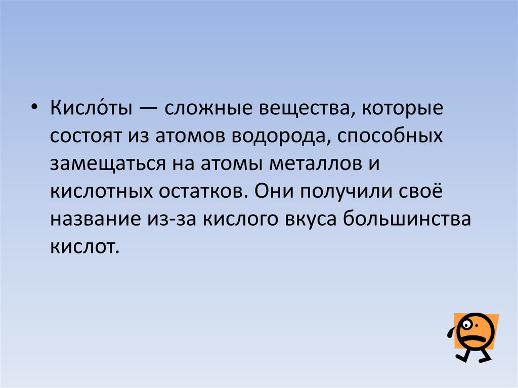 • Кисло́ты — сложные вещества, которыесостоят из атомов водорода, способных
