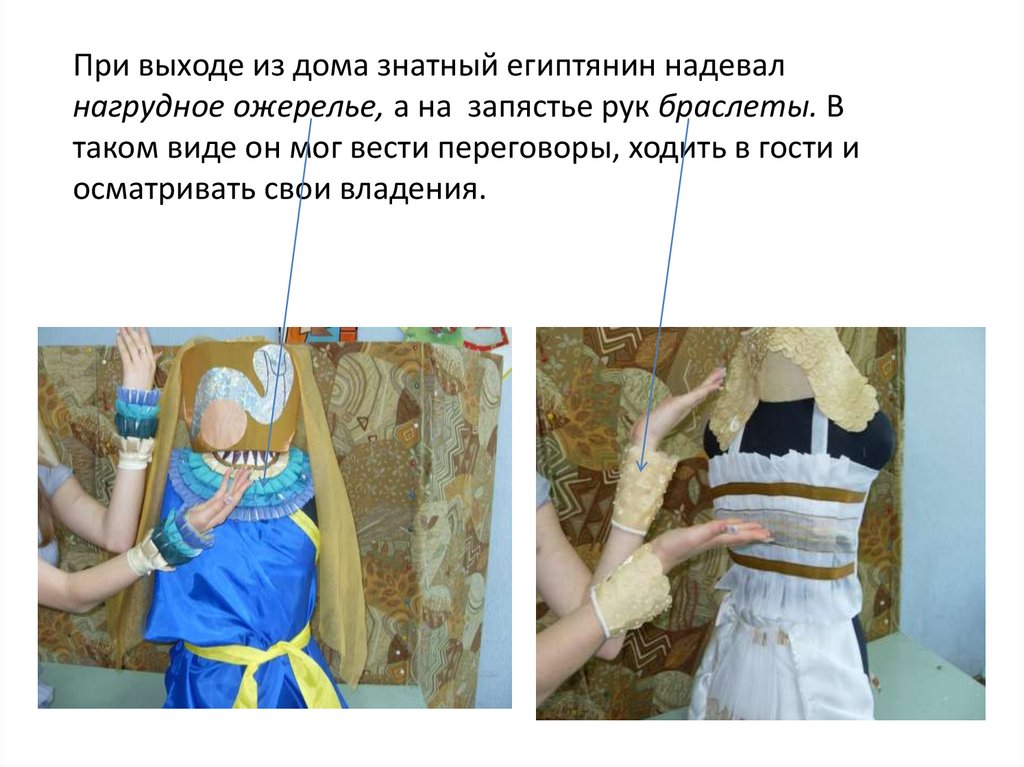 При выходе из дома знатный египтянин надевалнагрудное ожерелье, а на запястье рук браслеты. В