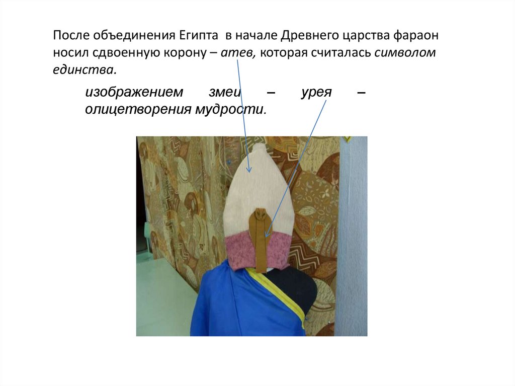 После объединения Египта в начале Древнего царства фараонносил сдвоенную корону – атев, которая считалась символом