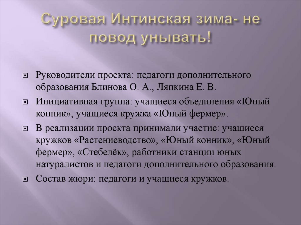 Руководители проекта: педагоги дополнительногообразования Блинова О. А., Ляпкина Е. В.