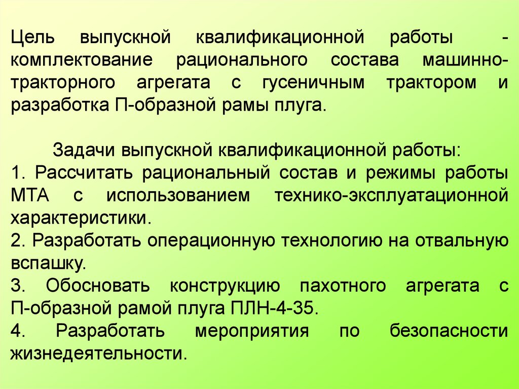 Цель выпускной квалификационной работыкомплектование рационального состава машиннотракторного агрегата с гусеничным трактором и