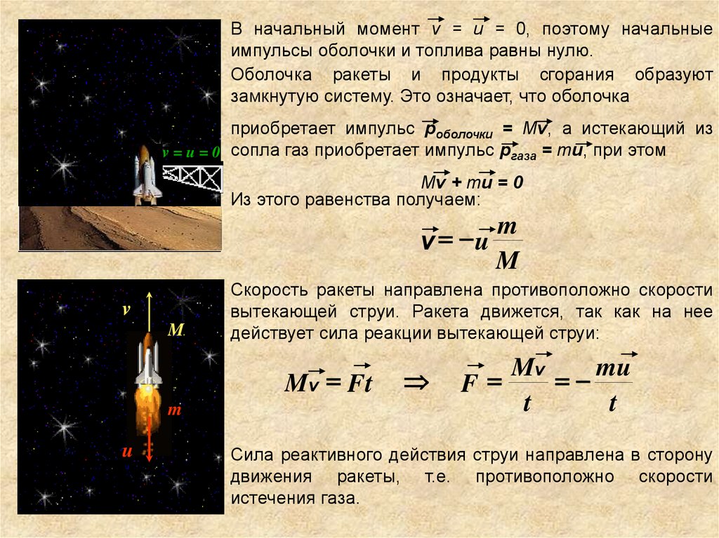 v = u = 0 сопла газ приобретает импульс pгаза = mu, при этом