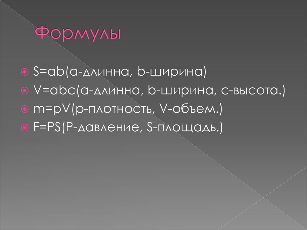 S=ab(a-длинна, b-ширина)V=abc(a-длинна, b-ширина, c-высота.)