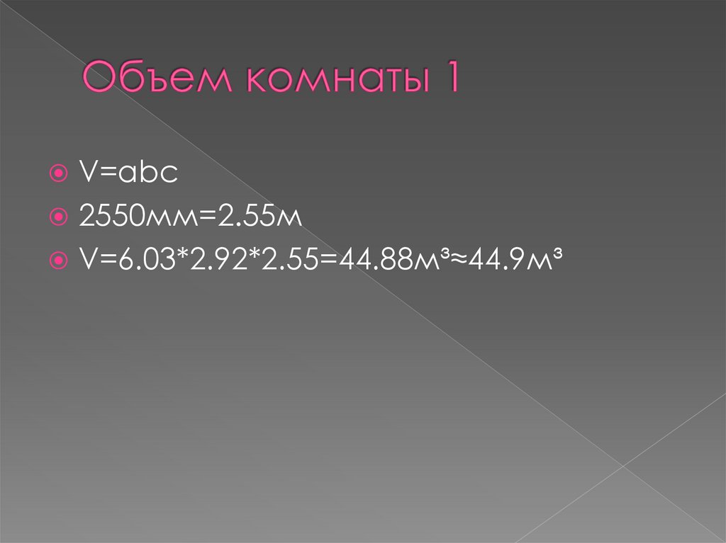 V=6.03*2.92*2.55=44.88м³≈44.9м³