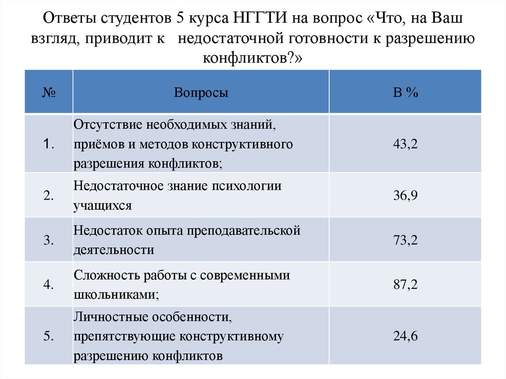 Ответы студентов 5 курса НГГТИ на вопрос «Что, на Вашвзгляд, приводит к недостаточной готовности к разрешению