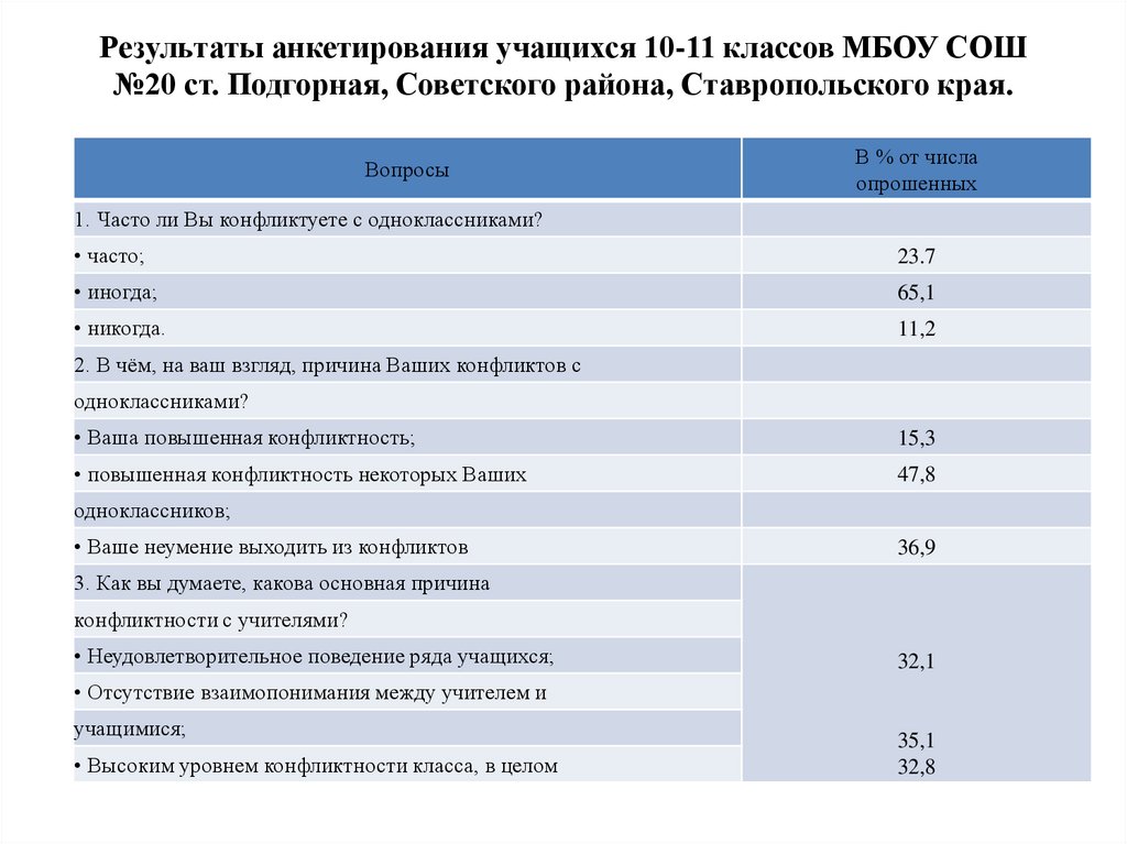 Результаты анкетирования учащихся 10-11 классов МБОУ СОШ№20 ст. Подгорная, Советского района, Ставропольского края.