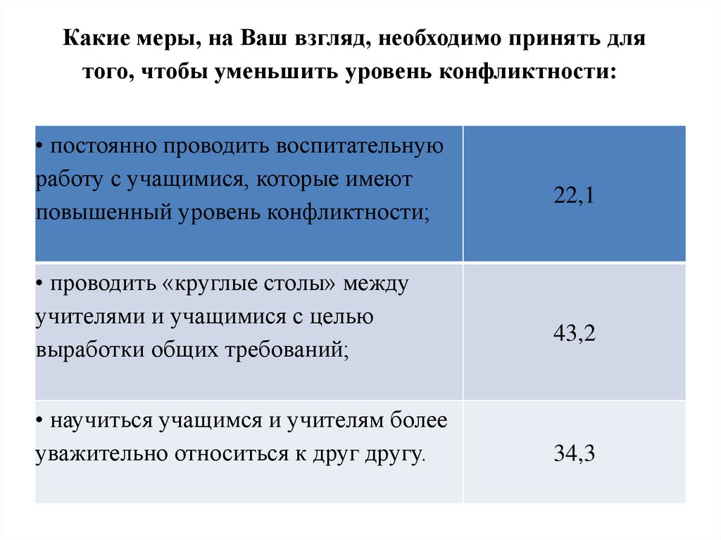 Какие меры, на Ваш взгляд, необходимо принять длятого, чтобы уменьшить уровень конфликтности:
