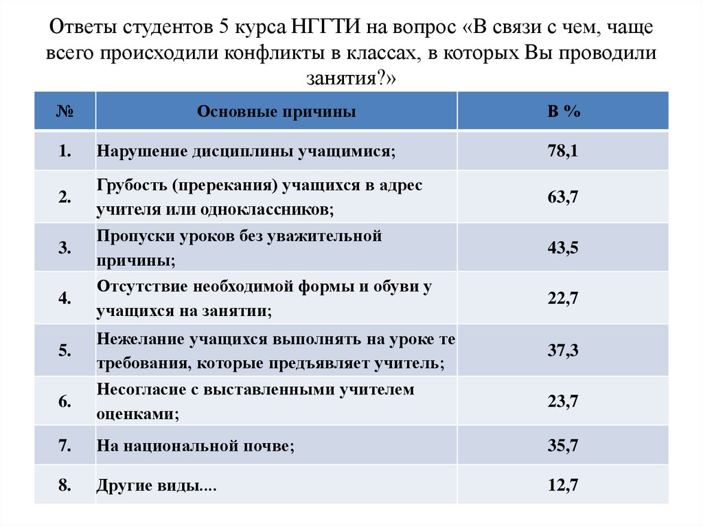 Ответы студентов 5 курса НГГТИ на вопрос «В связи с чем, чащевсего происходили конфликты в классах, в которых Вы проводили
