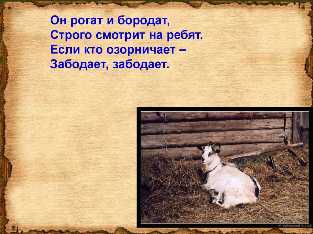 Он рогат и бородат,Строго смотрит на ребят.