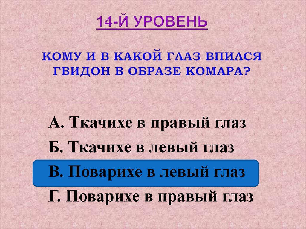 А. Ткачихе в правый глазБ. Ткачихе в левый глаз