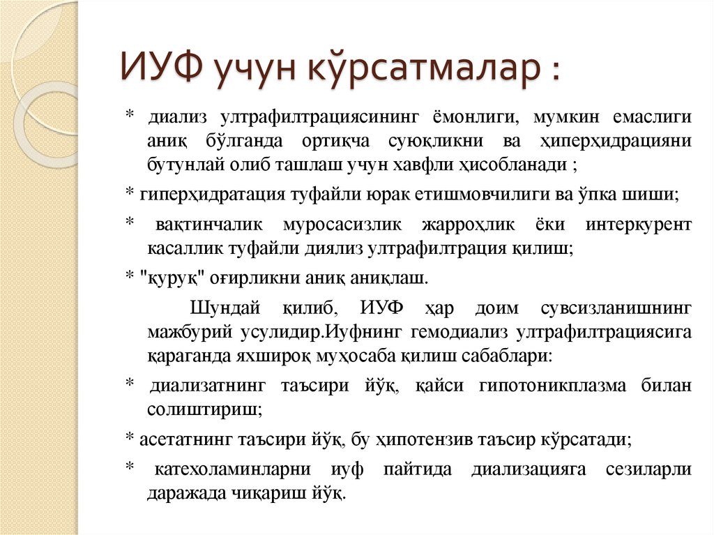 ИУФ учун кўрсатмалар :* диализ ултрафилтрациясининг ёмонлиги, мумкин емаслиги