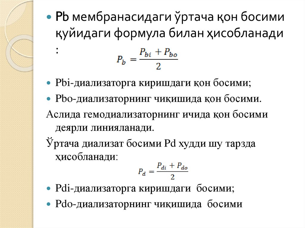Pb мембранасидаги ўртача қон босимиқуйидаги формула билан ҳисобланади