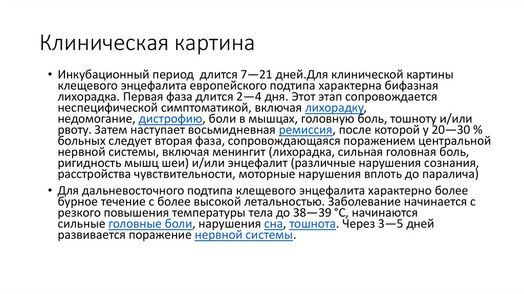 • Для дальневосточного подтипа клещевого энцефалита характерно более