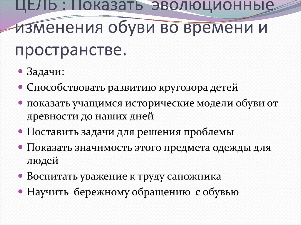 ЦЕЛЬ : Показать эволюционныеизменения обуви во времени и