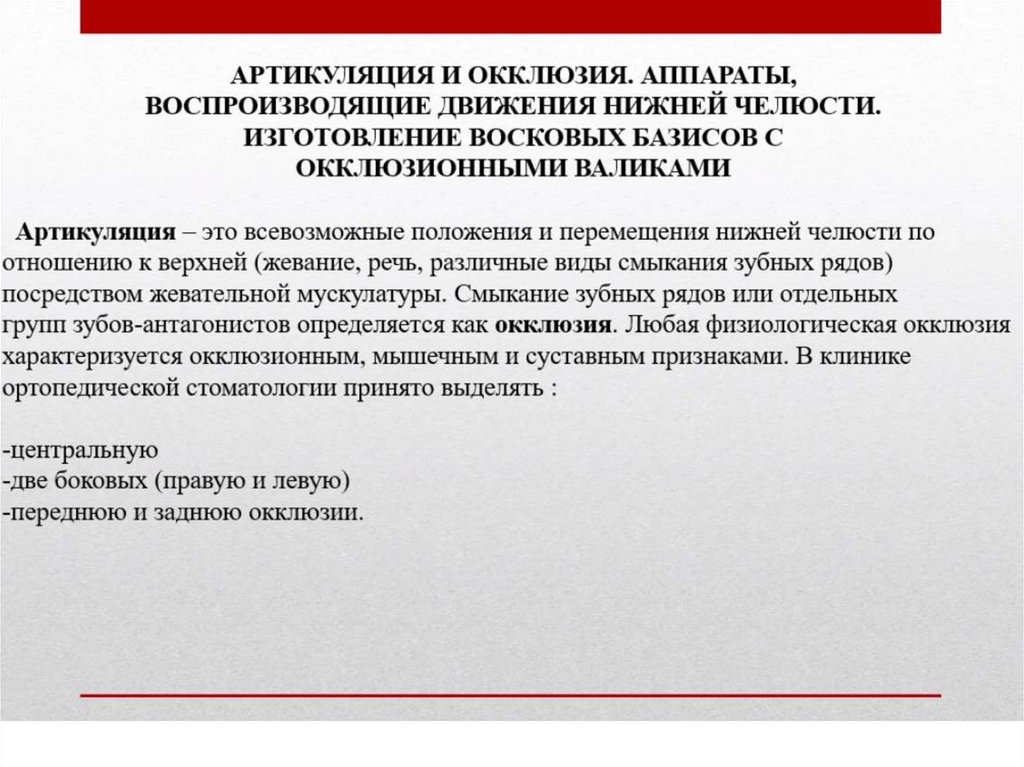 Артикуляция и окклюзия. Аппараты воспроизводящие движения нижней челюсти. Изготовление восковых базисов
