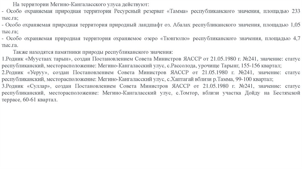 1.Родник «Муустаах тарын», создан Постановлением Совета Министров ЯАССР от 21.05.1980 г. №241, значение: статус