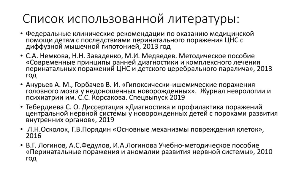 Список использованной литературы:• Федеральные клинические рекомендации по оказанию медицинской