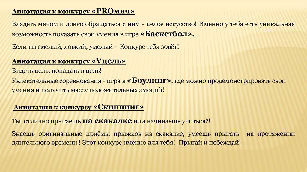 Аннотация к конкурсу «PROмяч»Владеть мячом и ловко обращаться с ним - целое искусство! Именно у тебя есть уникальная