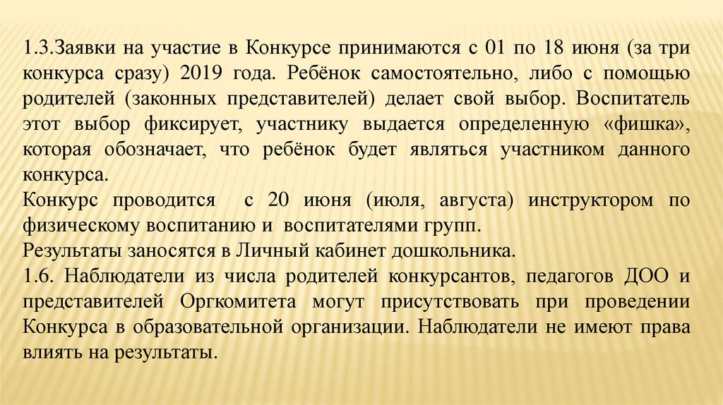 1.3.Заявки на участие в Конкурсе принимаются с 01 по 18 июня (за триконкурса сразу) 2019 года. Ребёнок самостоятельно, либо с помощью