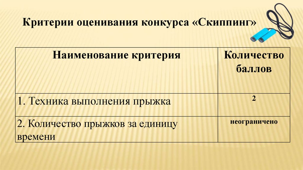 Критерии оценивания конкурса «Скиппинг»Наименование критерия