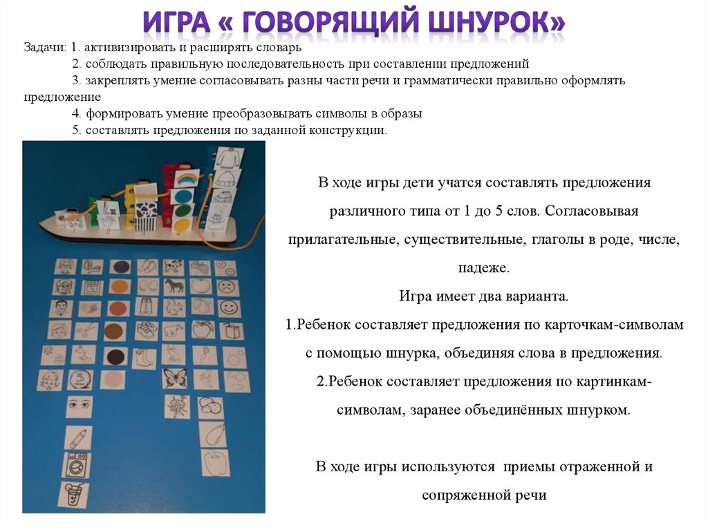 2.Ребенок составляет предложения по картинкамсимволам, заранее объединённых шнурком.