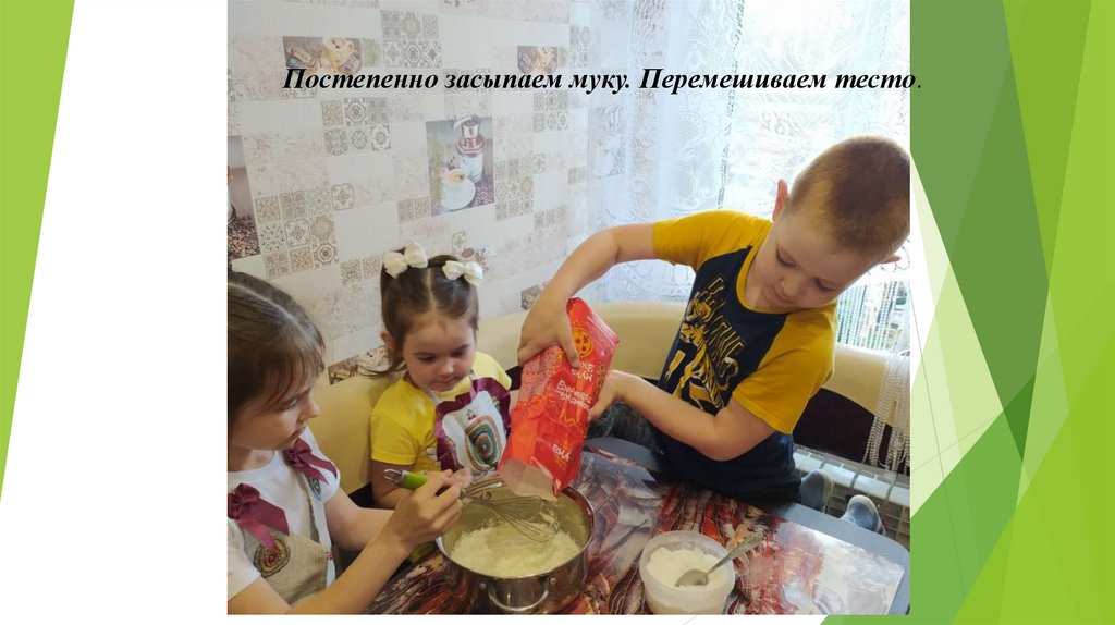 Постепенно засыпаем муку. Перемешиваем тесто.5.