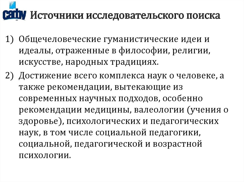 Источники исследовательского поиска1) Общечеловеческие гуманистические идеи и