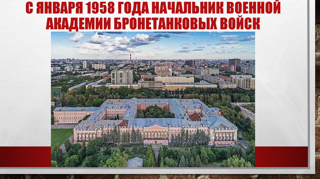 С ЯНВАРЯ 1958 ГОДА НАЧАЛЬНИК ВОЕННОЙАКАДЕМИИ БРОНЕТАНКОВЫХ ВОЙСК