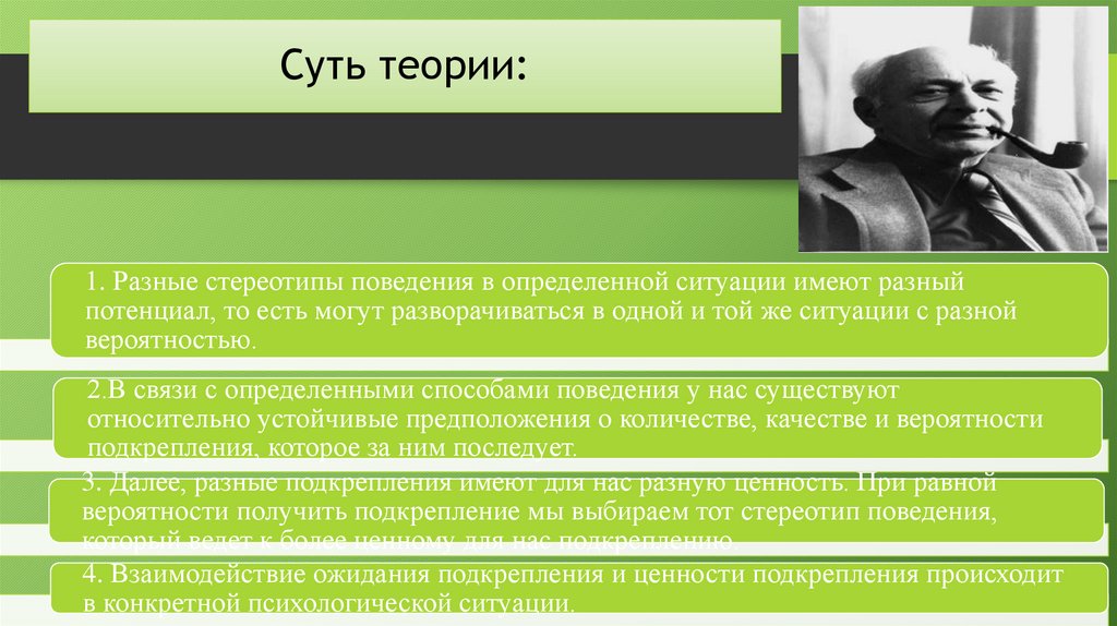 Суть теории:1. Разные стереотипы поведения в определенной ситуации имеют разный