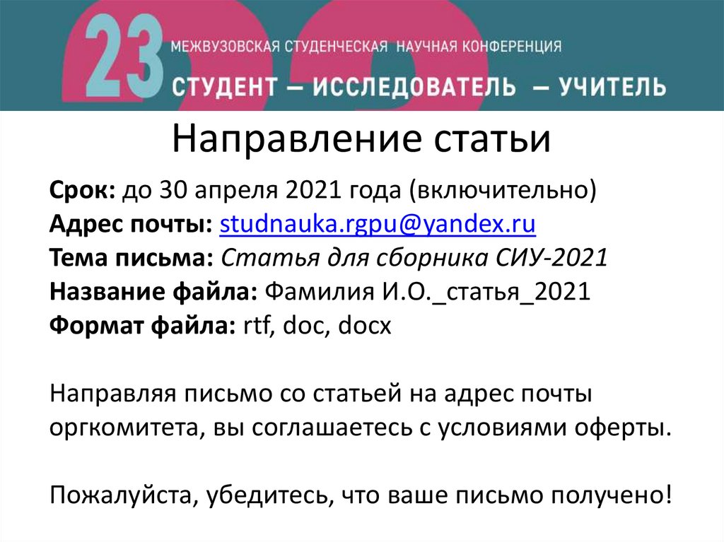 Направляя письмо со статьей на адрес почты