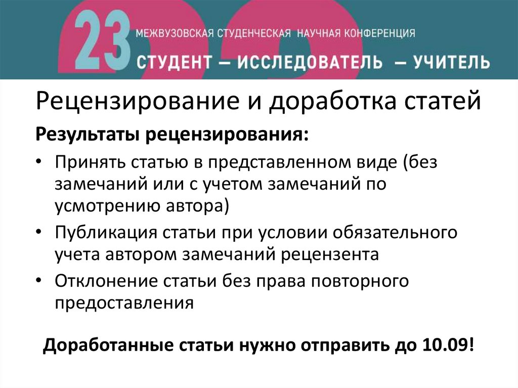 Доработанные статьи нужно отправить до 10.09!