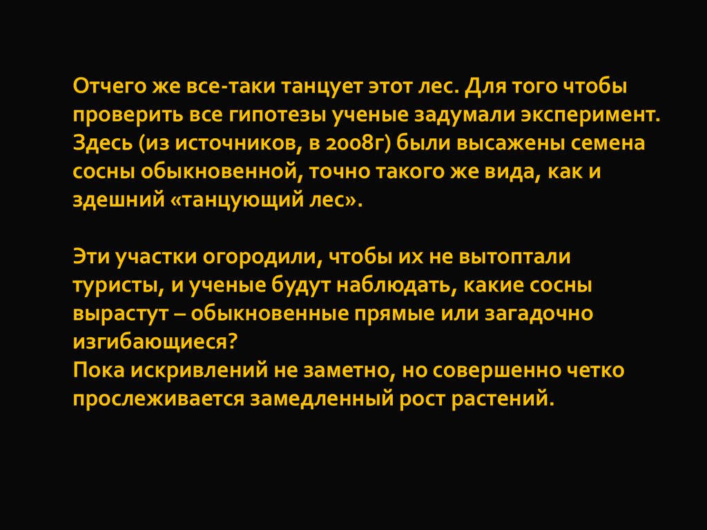 Отчего же все-таки танцует этот лес. Для того чтобыпроверить все гипотезы ученые задумали эксперимент.